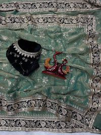 Teal Blue Designer Organza Saree with Elegant...