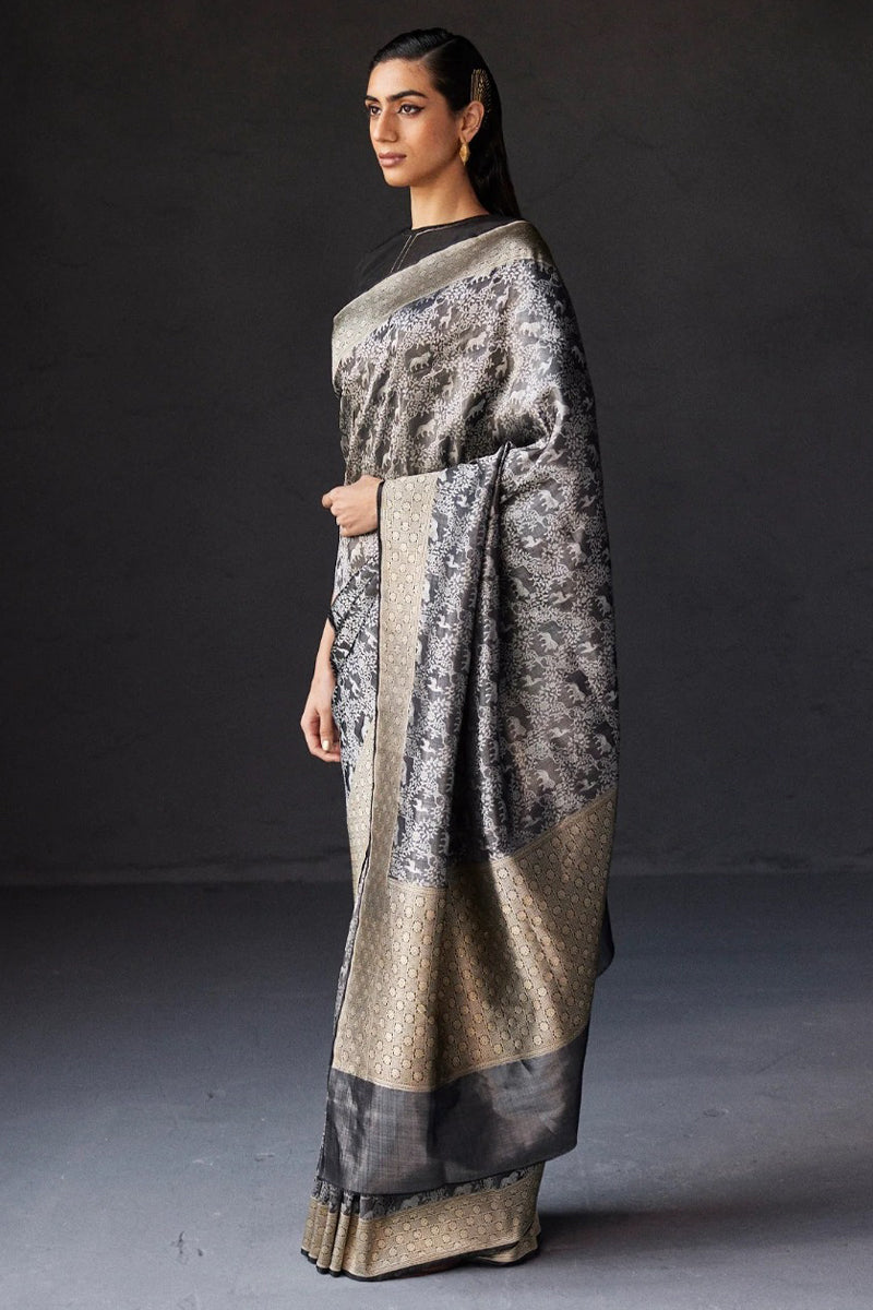 Elevate your style quotient with our exquisite Adorning Grey Soft Silk Saree, exuding elegance and sophistication. Made from premium quality silk, this saree drapes beautifully, accentuating your curves and adding a touch of glamour to your look.