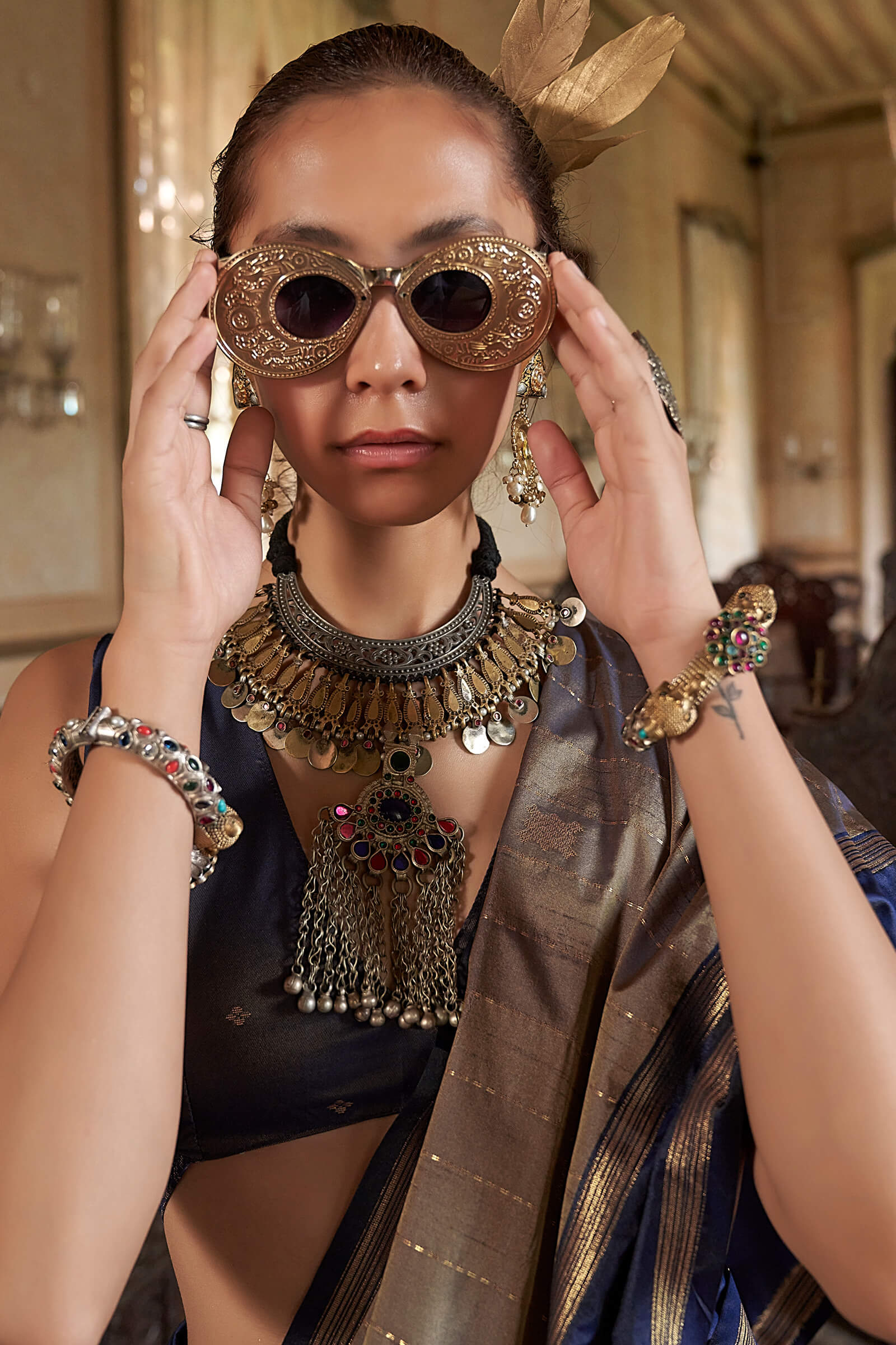 BLOUSE SPECIFICATION: Fabric: Banarasi Tussar Silk Colour: Navy Blue Work Type: Zari Weaving Stitching Type: Unstitched