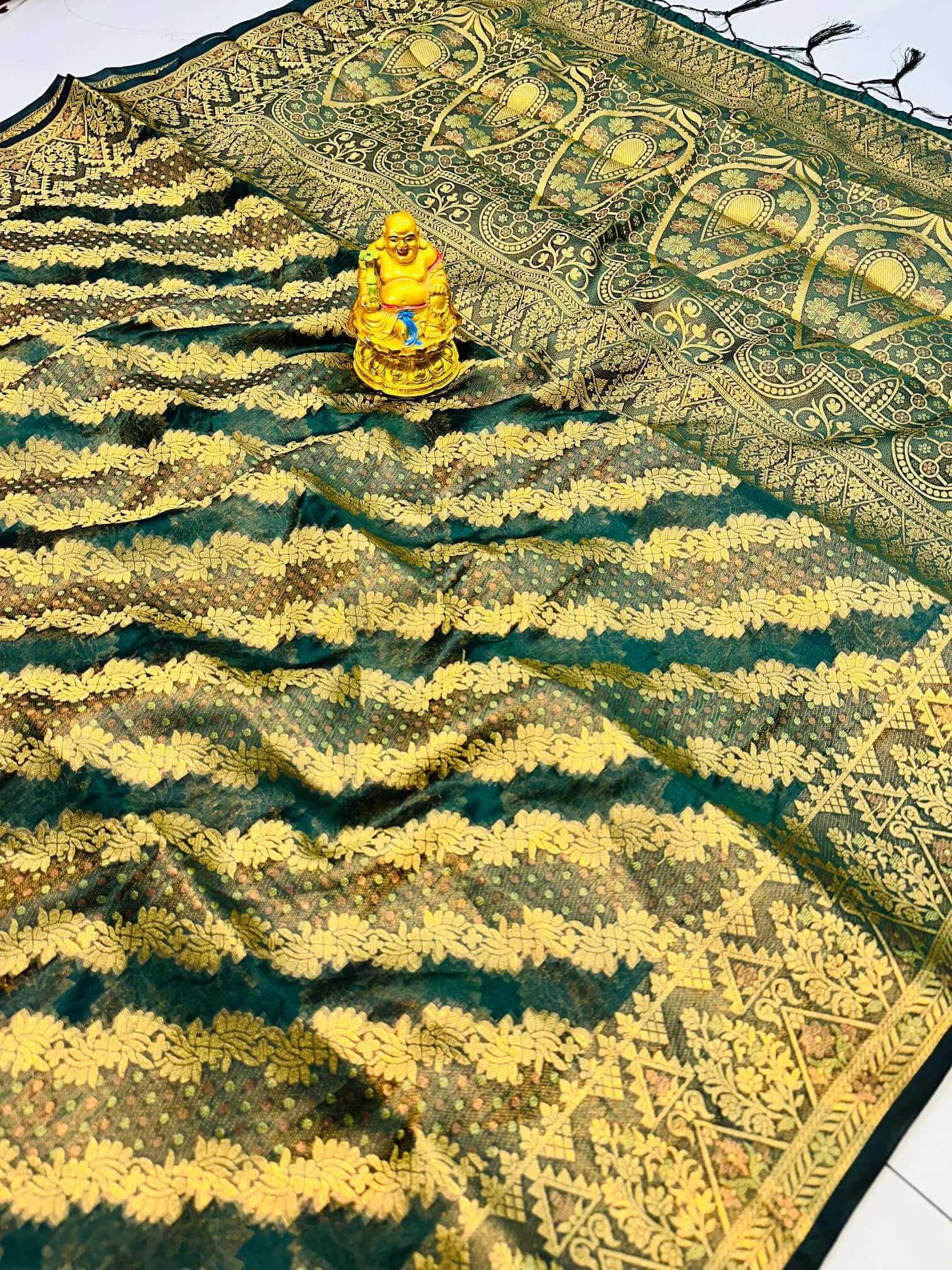Olive Gold Banarasi Silk Saree – Elegant Zari Butta Weave