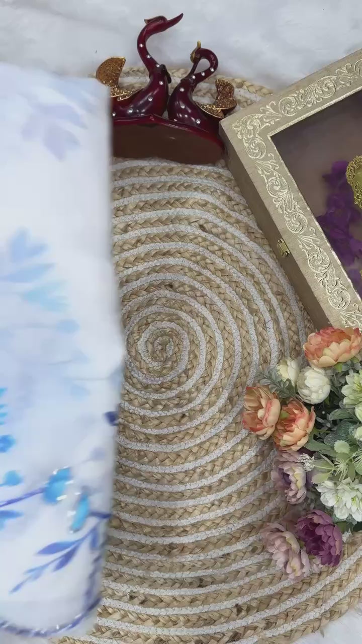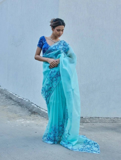 Grace your ethnic collection with this refreshing aqua blue net saree, beautifully adorned with intricate blue floral embroidery. The lightweight net fabric drapes effortlessly, creating an airy and elegant silhouette perfect for day-to-evening occasions.