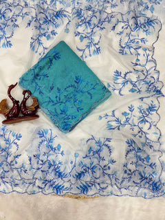 Aqua Blue Net Saree with Blue Floral Embroidery & Scalloped Border