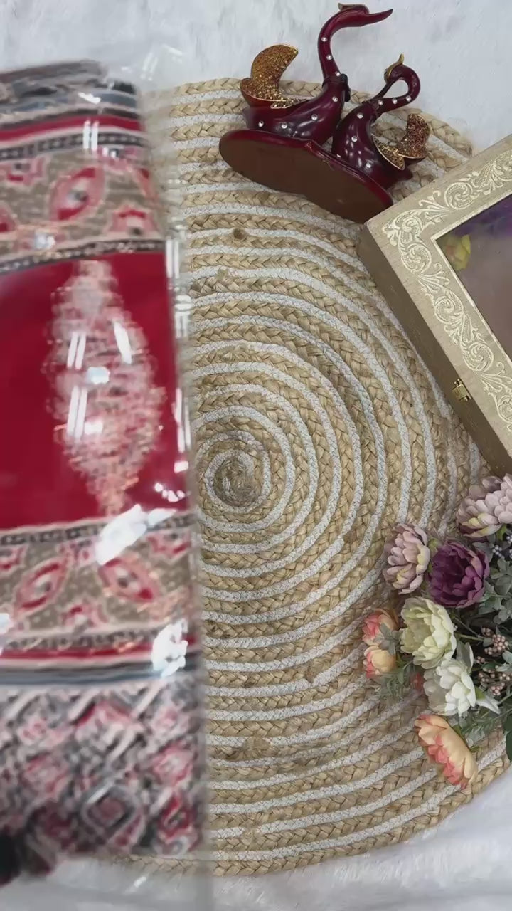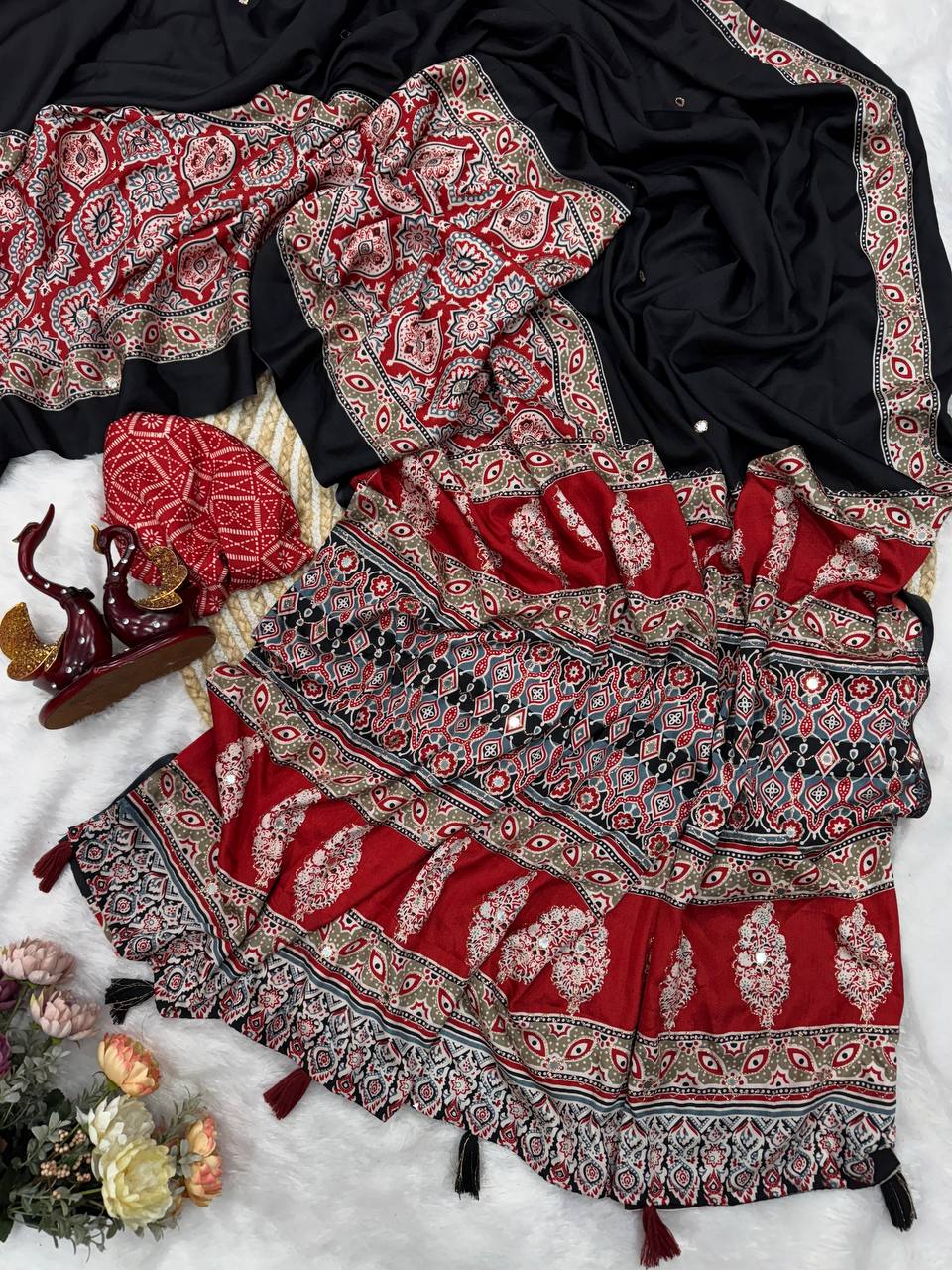 Elevate your ethnic style with this stunning black and maroon Ajrakh print saree, a perfect blend of tradition and modern elegance. The deep black base is beautifully contrasted with rich maroon and earthy-toned Ajrakh-inspired motifs, creating a bold yet graceful look.