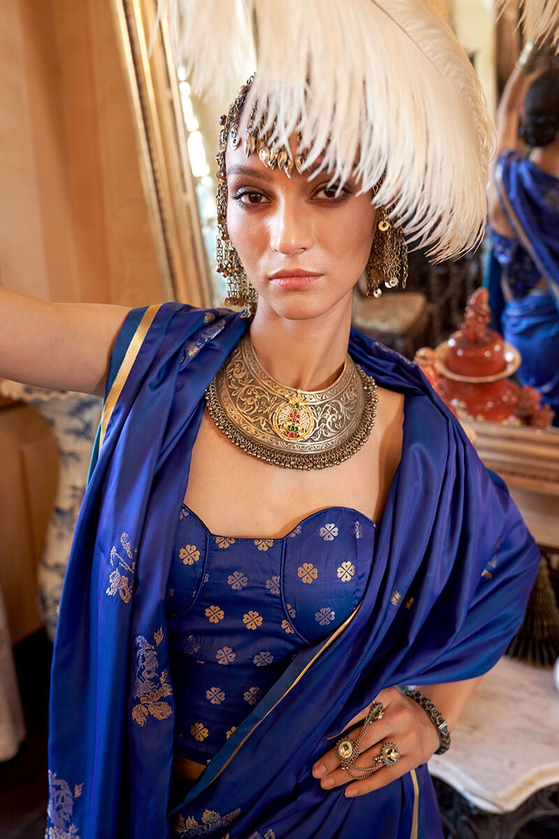 BLOUSE SPECIFICATION: Fabric: Banarasi Satin Silk Colour: Royal Blue Work Type: Jacquard Weaving Stitching Type: Unstitched