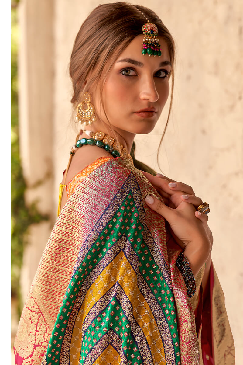 Elevate your traditional wardrobe with the luxurious Soft Banarasi Silk Saree. Crafted from the finest silk material, this saree exudes opulence and sophistication. The intricate Banarasi weaving and delicate floral motifs add a touch of elegance to any occasion.