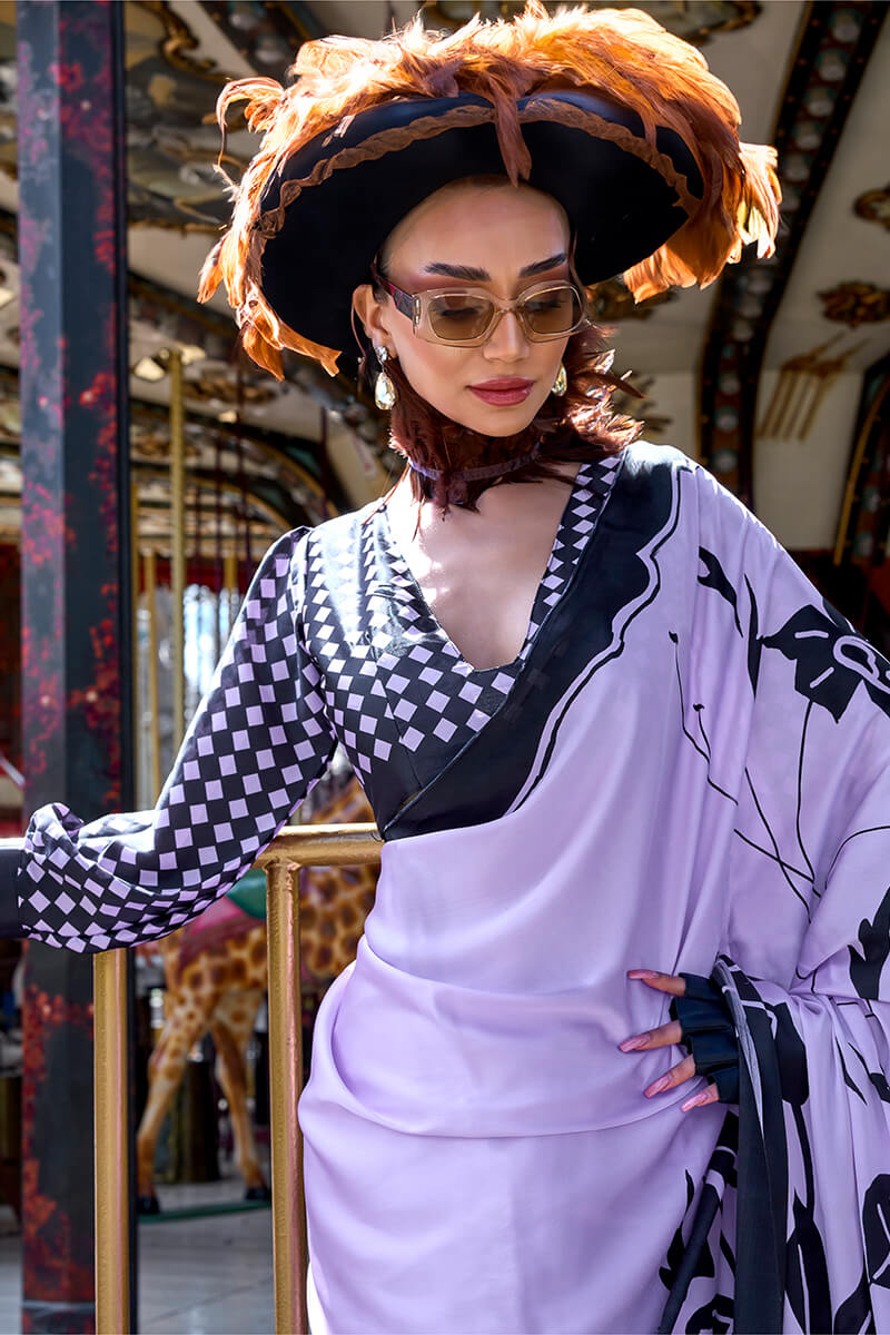 Elaborate Lavender Digital Printed Satin Silk Saree With Pulsating Blouse Piece