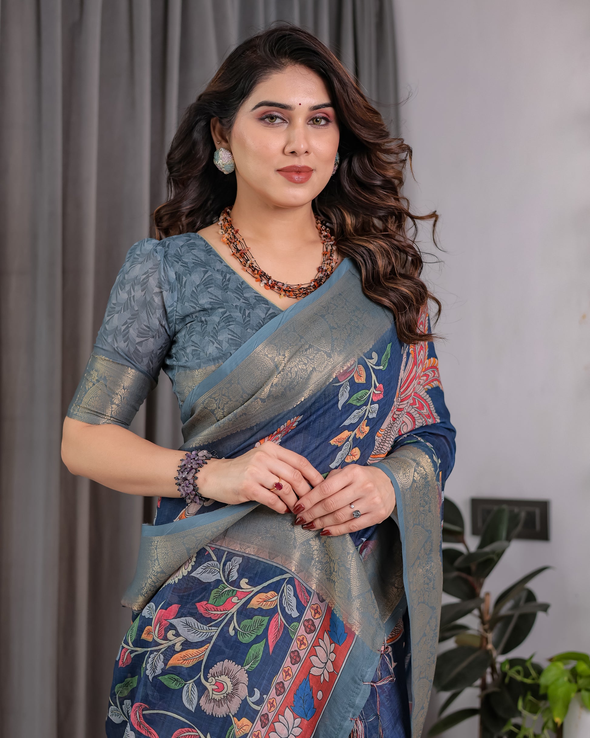 The saree features a rich navy blue base, beautifully adorned with royal bird and floral motifs inspired by traditional heritage art forms. The artistic detailing of colorful birds and blooming florals creates a lively yet sophisticated visual appeal that reflects elegance and cultural richness.