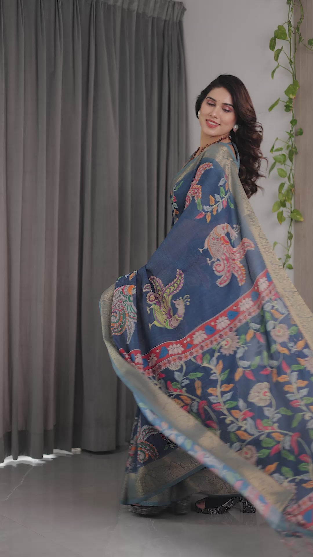 Premium art silk fabric with rich luxurious sheen Deep navy blue base for timeless elegance Artistic bird and floral heritage-inspired motifs Antique gold woven border for regal finish Ornamental pallu with detailed storytelling artwork Lightweight drape with graceful fall