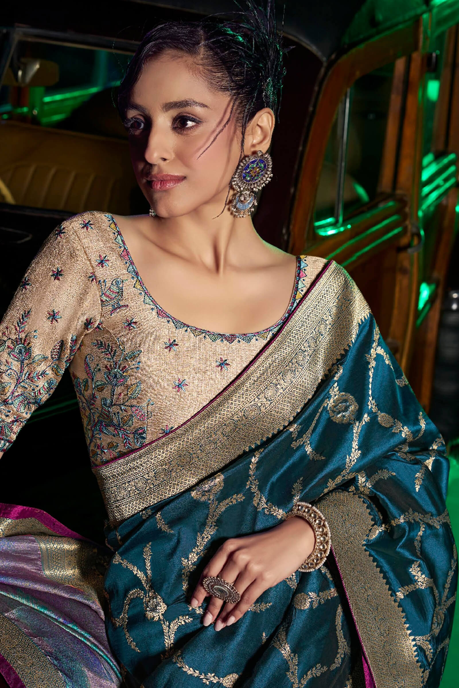 Ideal Rama Soft Banarasi Silk Saree With Sizzling Blouse Piece