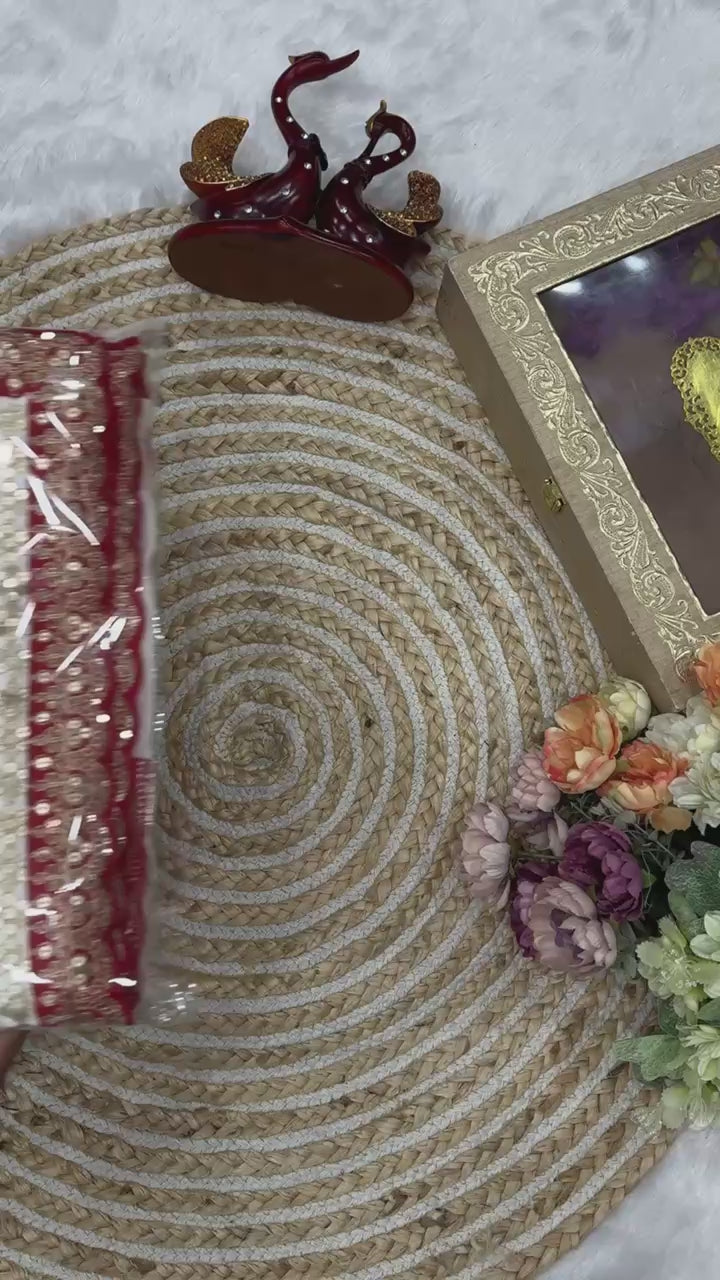 The saree is beautifully framed with a heavy wine red scalloped border, intricately embroidered with zari and sequin detailing that adds depth, shimmer, and celebration-ready charm. Fine gold accent lines along the border enhance the overall richness while maintaining a refined, balanced look.