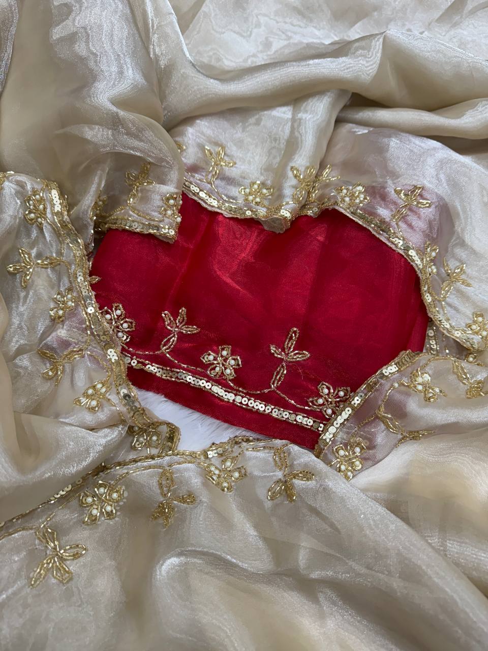 Ivory Organza Saree with Gold Floral Embroidery Border & Red Blouse Piece