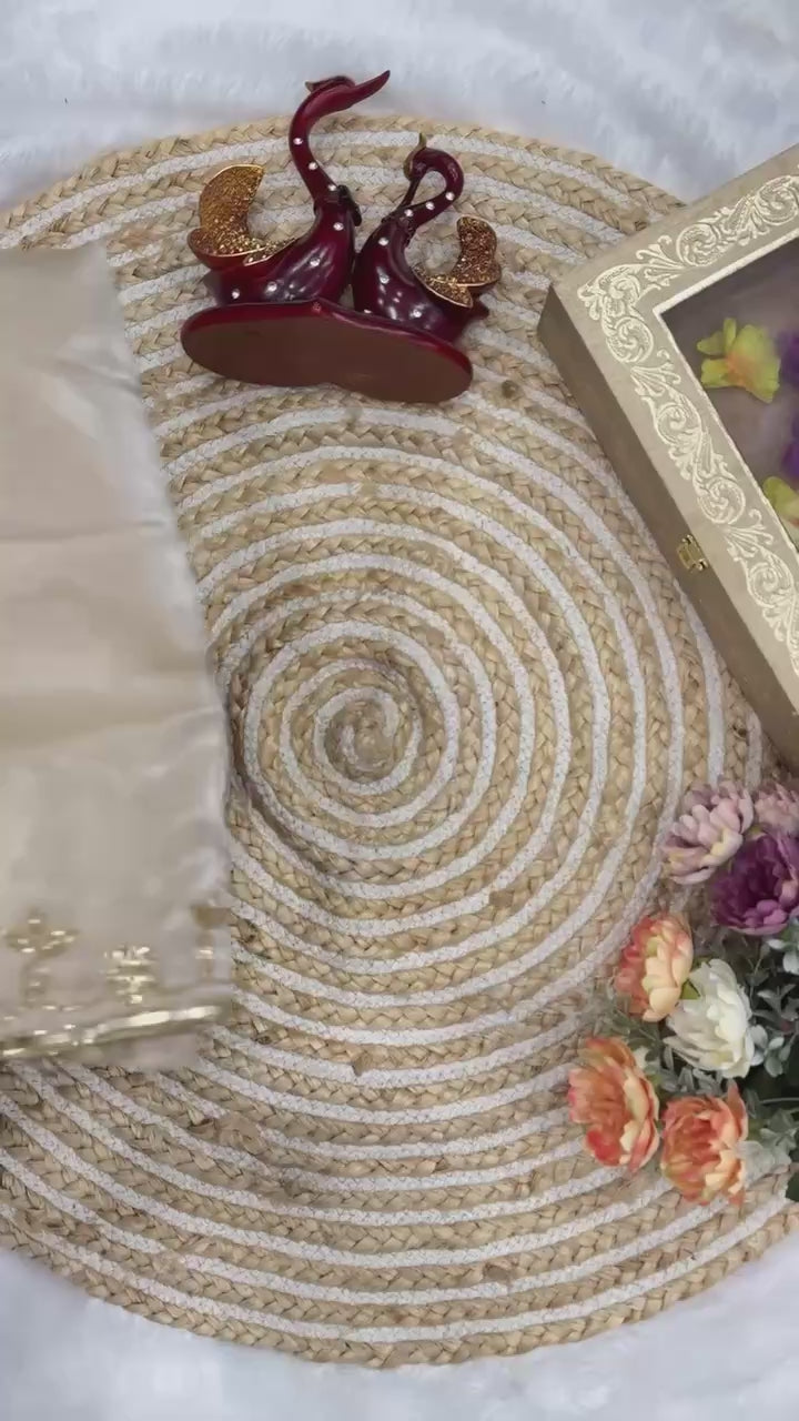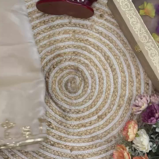 Elevate your ethnic wardrobe with this elegant organza saree, beautifully designed with delicate gold floral embroidery along the border. The soft ivory base enhances the sheer texture of the fabric, while the finely detailed floral motifs add a subtle yet luxurious charm.