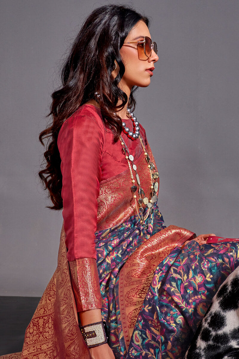 BLOUSE SPECIFICATION: Fabric: Kashmiri Modal Silk Colour: Navy Blue Work Type: Jacquard Weaving Stitching Type: Unstitched
