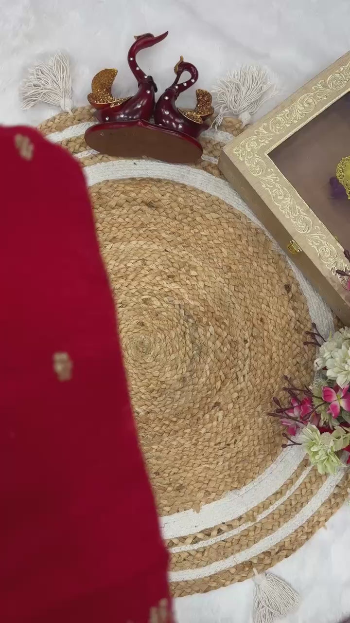 Step into grandeur with this luxurious red saree, exquisitely crafted for weddings and grand celebrations. The saree showcases rich all-over zari and sequin embroidery with intricate floral and paisley motifs, creating a royal and opulent appearance. The detailed craftsmanship along the borders and pallu adds depth, richness, and traditional elegance.