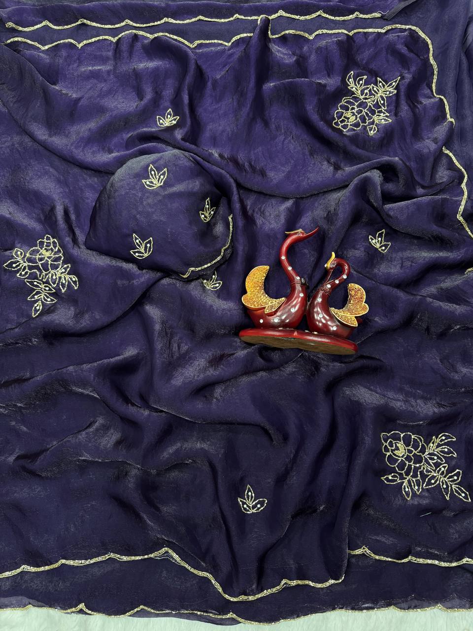 Midnight Navy Chiffon Blouse with Gold Floral Hand Embroidery & Scalloped Finish