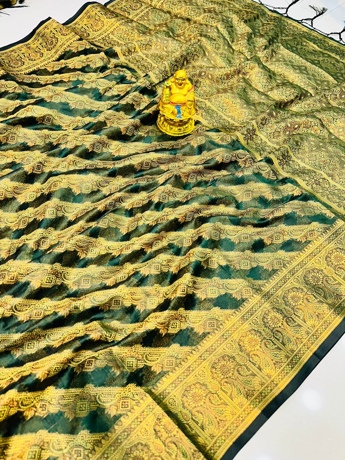 The intricate timeless design on this grand saree is perfect for a grand occasion. orgenza sarees are always in with their royal appeal. Made out of chosen threads, this choice will make you stand out. Drape it as you like, it will look flawless.