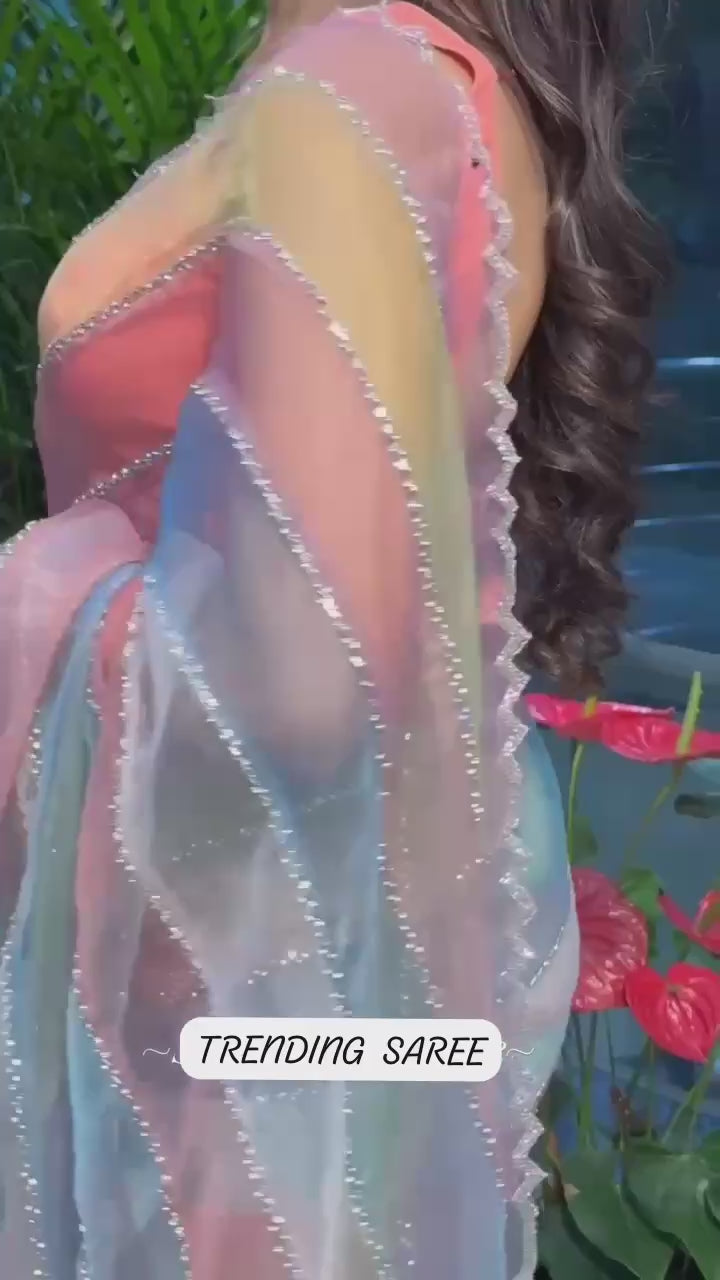 Refresh your ethnic wardrobe with this soft and elegant pastel multi-color organza saree, designed for a modern yet graceful look. The saree features soothing vertical pastel stripes in sky blue, blush pink, and peach tones, enhanced with delicate sequin detailing that adds a subtle shimmer without overpowering the simplicity of the design.