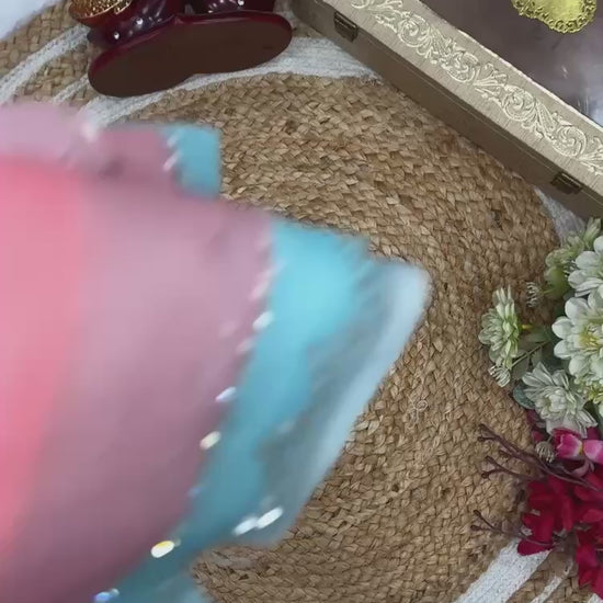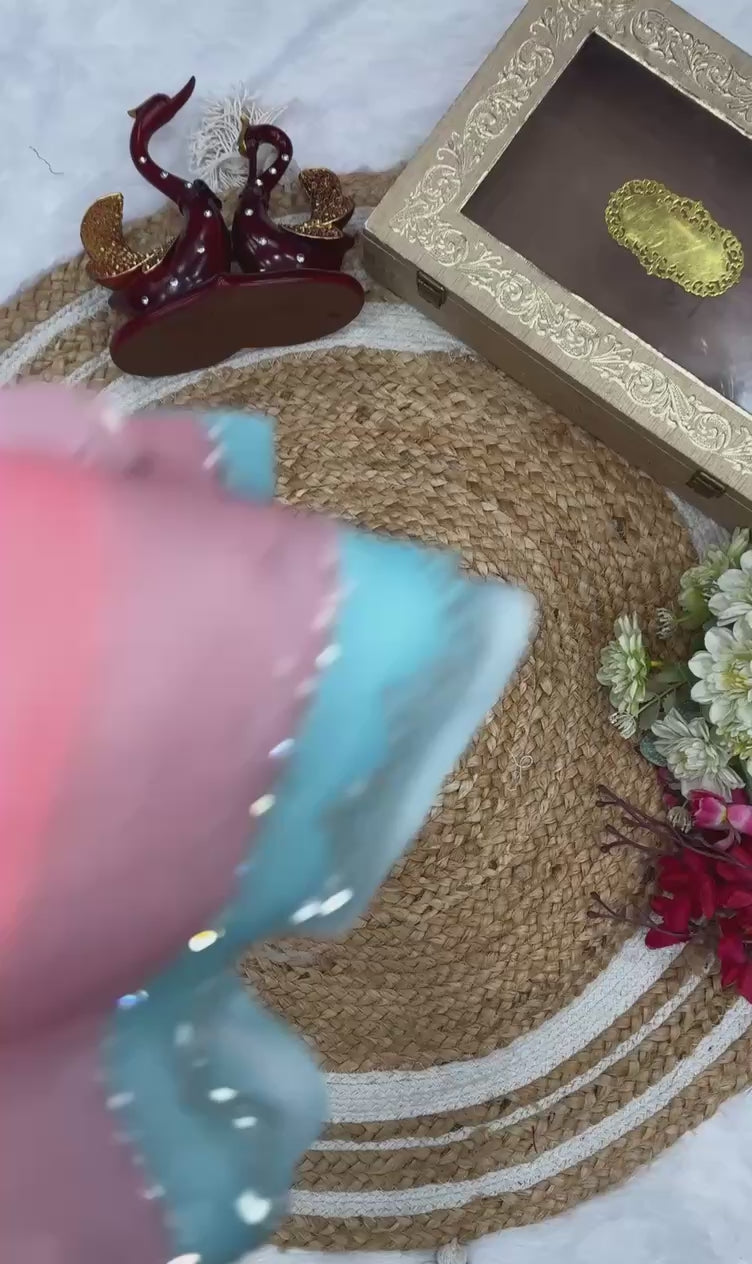 Paired with a matching solid pastel pink blouse piece, this saree offers a light, airy drape and effortless elegance. Perfect for daytime celebrations, brunch parties, and festive gatherings, it is an ideal choice for women who prefer minimal yet stylish ethnic wear.