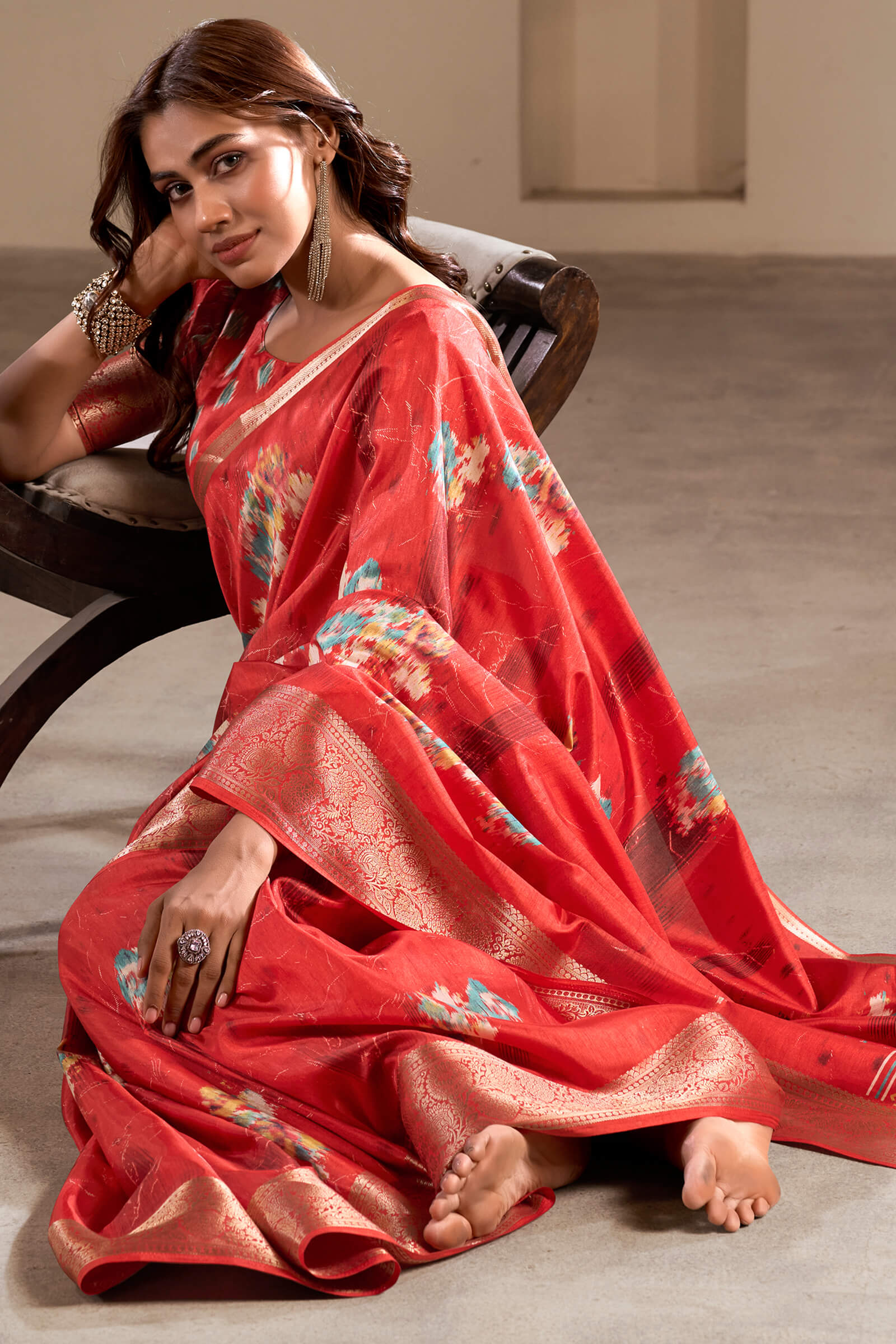 Piquant Red Digital Printed Dola Silk Saree With Evocative Blouse Piece
