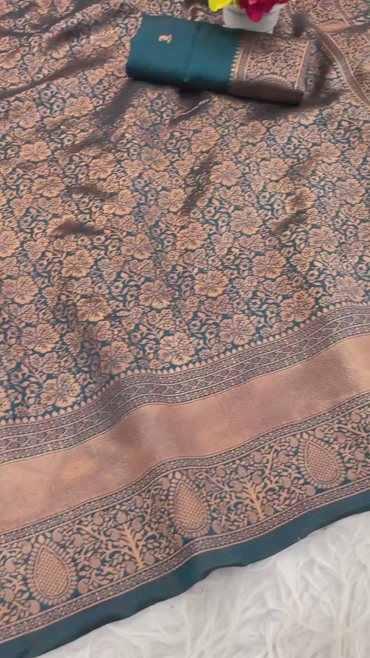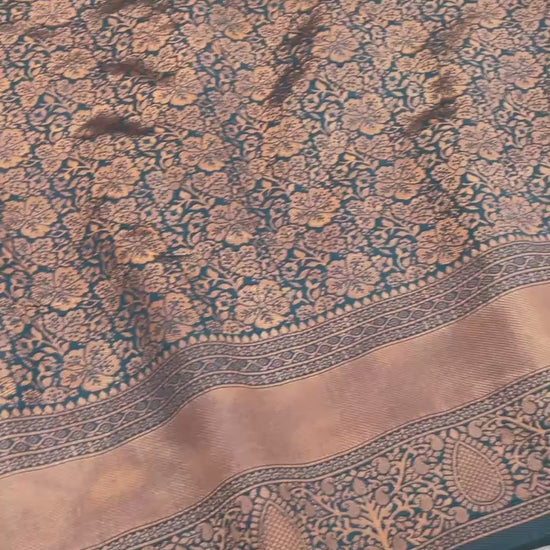 An expression of timeless grandeur and elite craftsmanship — this premium luxury teal blue silk saree is designed for women who love rich traditional aesthetics with a majestic presence. The saree features dense all-over antique gold zari floral weaving, creating a lavish texture that feels royal, heavy, and undeniably luxurious.