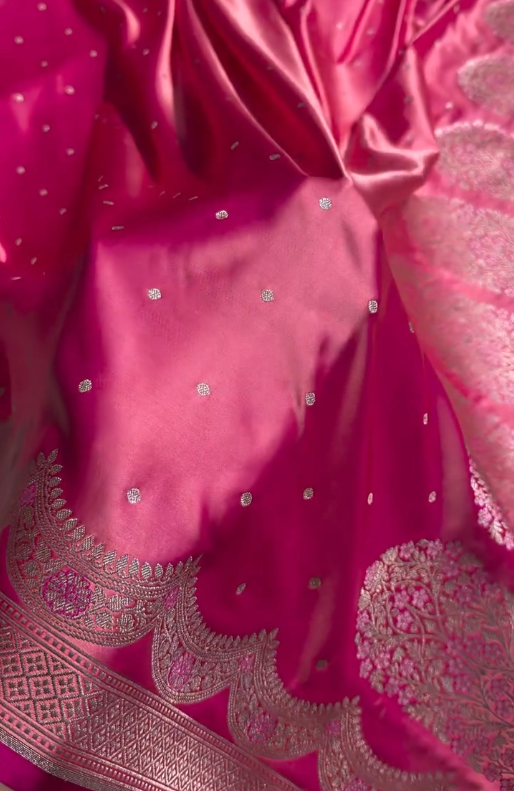 Add a touch of refined elegance to your ethnic wardrobe with this beautiful Rani Pink Banarasi Silk Saree. Crafted from premium Banarasi silk, the saree features a rich pink base enhanced with delicate silver zari buti motifs scattered gracefully across the body. The soft sheen of the silk lends a luxurious finish, making it perfect for both daytime and evening occasions.