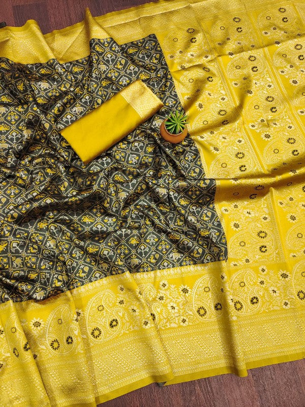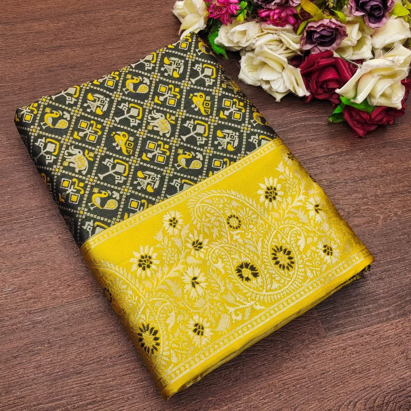 Elevate your traditional wardrobe with this exquisite Soft Silk Saree. Crafted from luxurious silk material, this saree drapes beautifully and feels incredibly soft against the skin. Perfect for special occasions or everyday wear, this saree exudes elegance and sophistication.SAREE SPECIFICATIONS:Fabric: Soft SilkColour: Black Work Type: JacquardBLOUSE SPECIFICATION:Fabric: Soft SilkColour: YellowWork Type: JacquardStitching Type: UnstitchedSET CONTAIN:Saree With Blouse Piece In The Box: 1 Saree :: 1 Blouse Piece,Saree : 5.50Mtr :: Blouse Piece: 0.80MtrLEGAL DESCRIPTION:Product Care Instructions: Dry Clean OnlyThere Might Be Minor Colour Variation Between Actual Product And Image Shown On Screen Due To Lighting On The Photography.