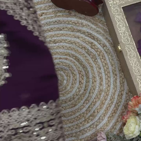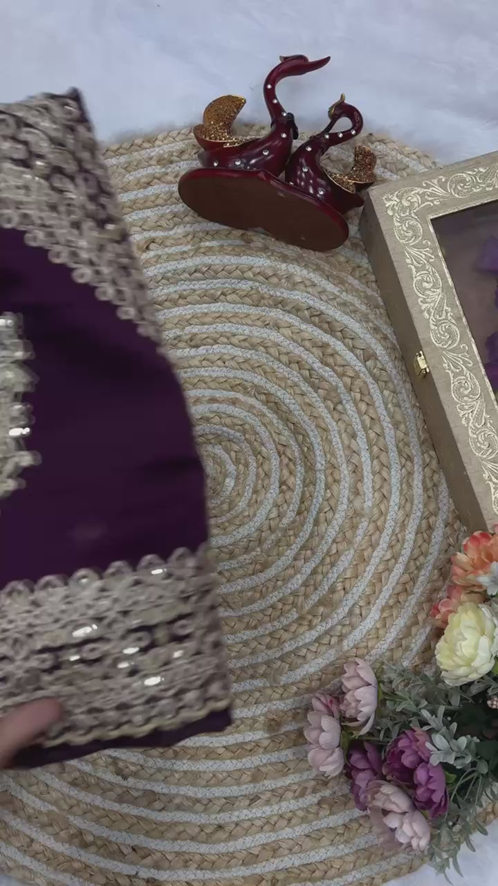 The saree comes with a perfectly coordinated unstitched blouse, enhanced with matching embroidery on the neckline, sleeves, and hem, creating a complete festive ensemble. The deep purple shade paired with gold detailing makes this saree ideal for evening events and grand celebrations.