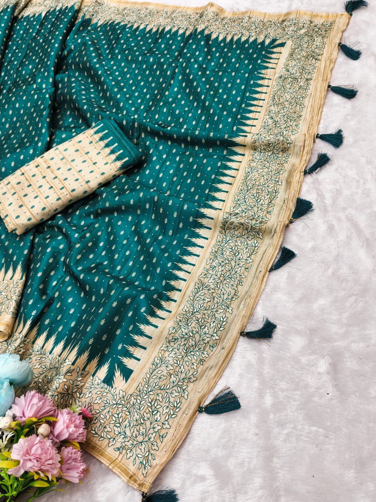 SAREE SPECIFICATIONS: Fabric: Tussar Silk Colour: Rama Work Type: Embroidery Work