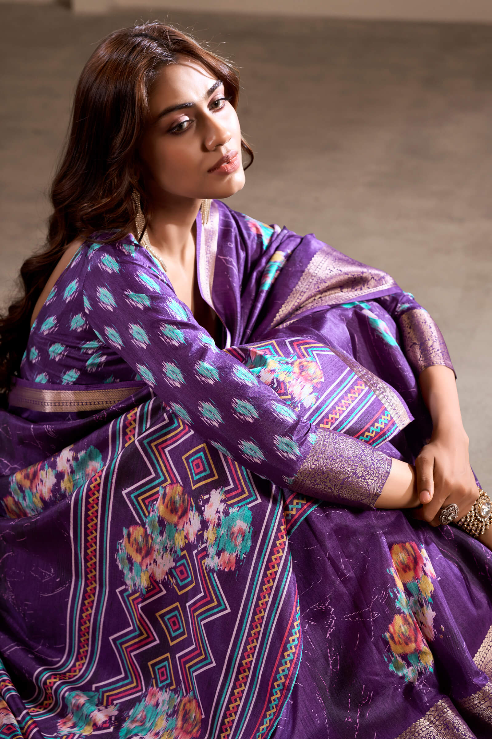 SAREE SPECIFICATIONS: Fabric: Dola Silk Colour: Purple Work Type: Digital Printed & Zari Weaving