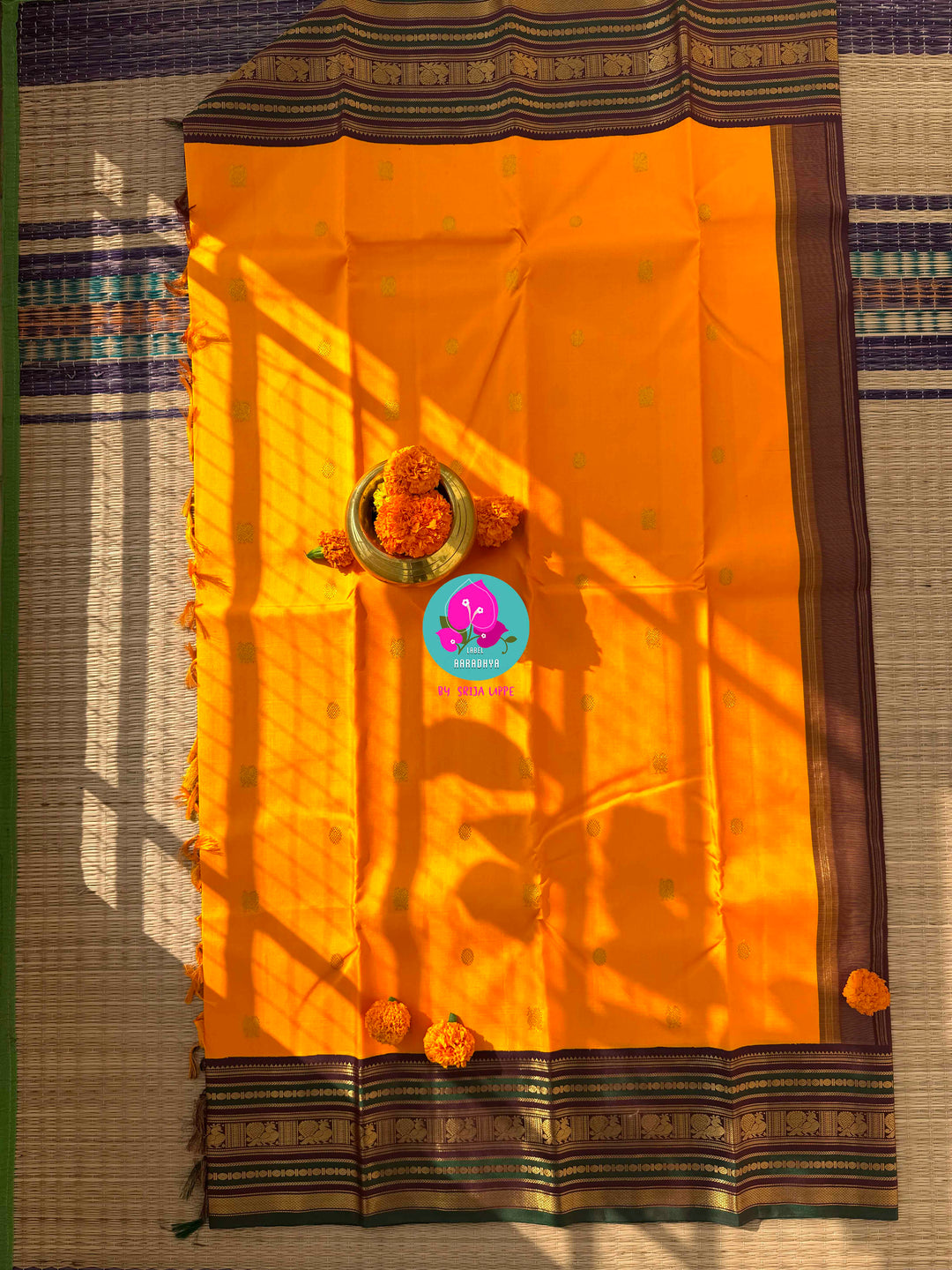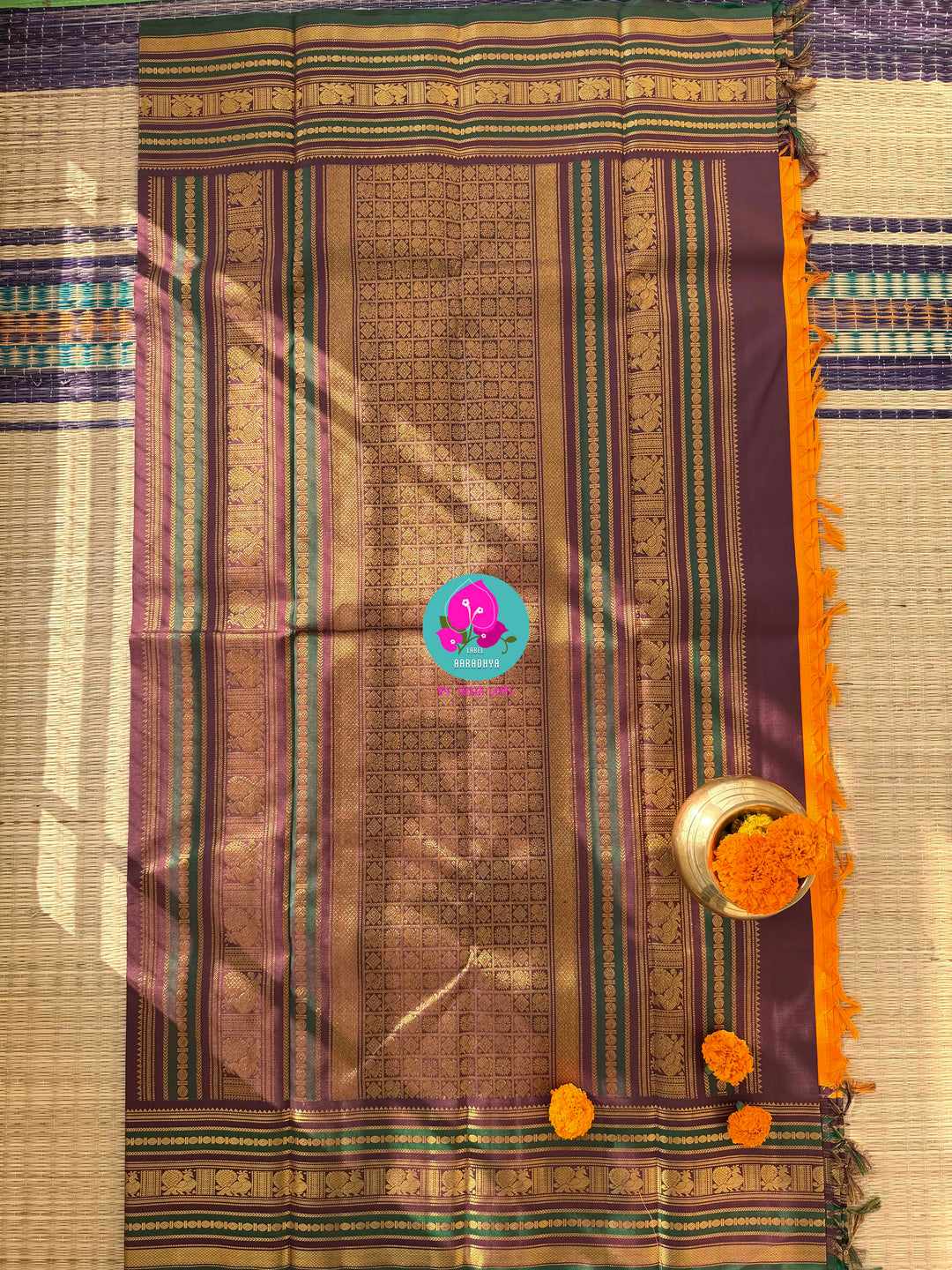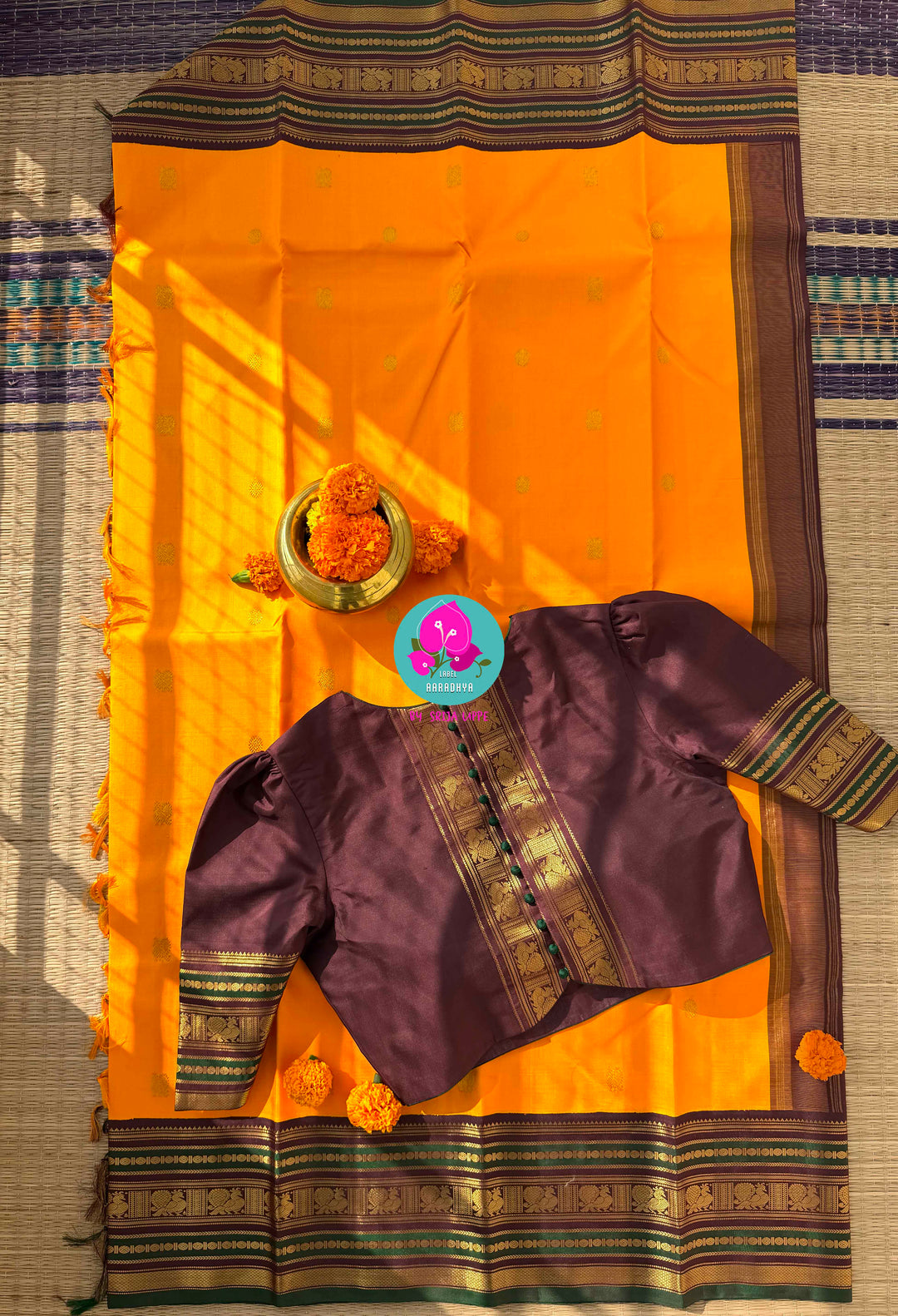 The luxurious contrast of mustard with royal maroon and green creates a festive statement, making it perfect for weddings, haldi ceremonies, temple functions, and cultural celebrations.