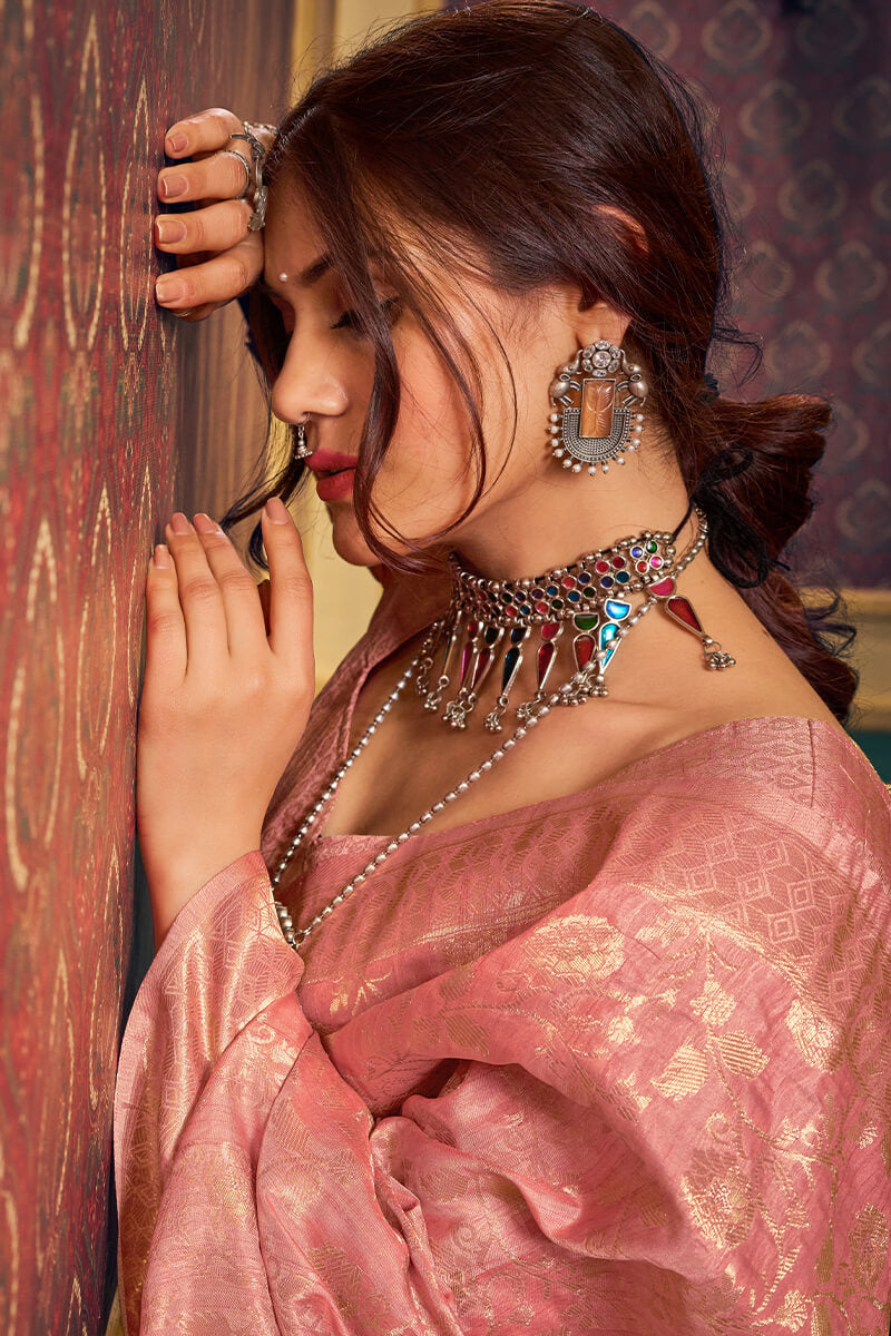 Supernal Peach Soft Banarasi Silk Saree With Fragrant Blouse Piece