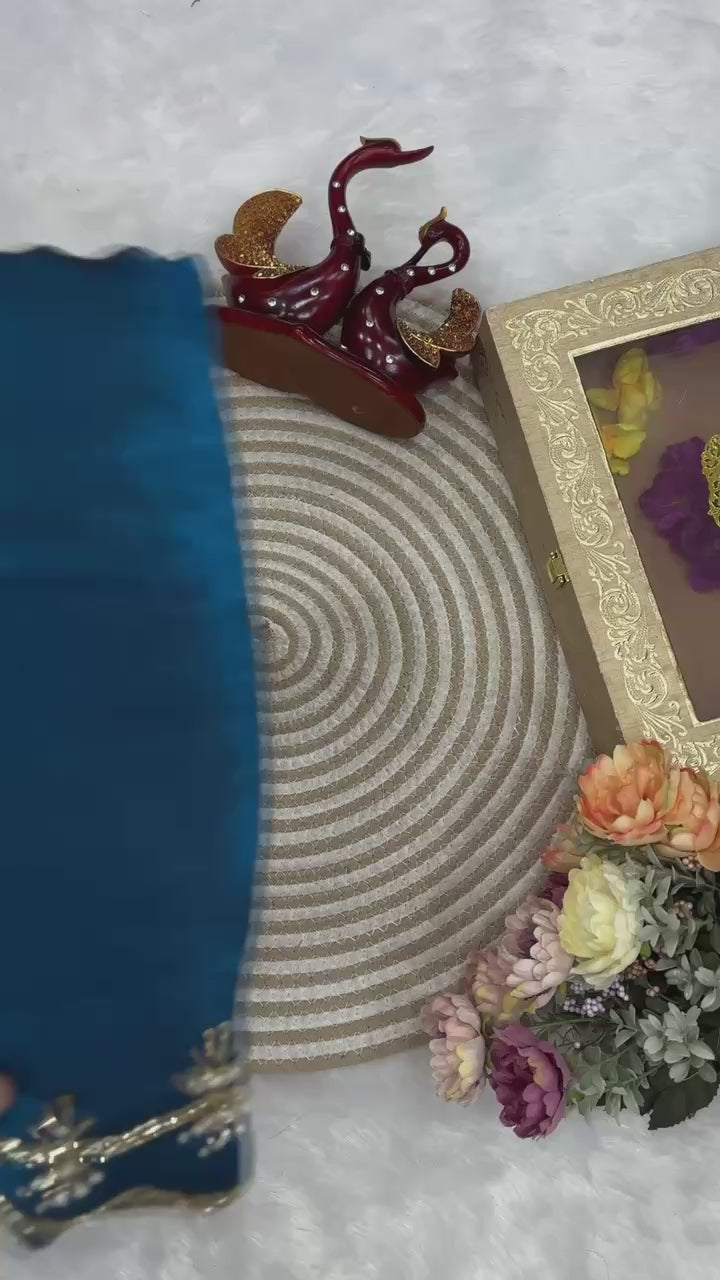 Elevate your ethnic wardrobe with this graceful teal blue designer organza saree, crafted to reflect timeless elegance and refined craftsmanship. The lightweight organza fabric offers a soft, airy drape, making it perfect for long festive and celebratory wear.