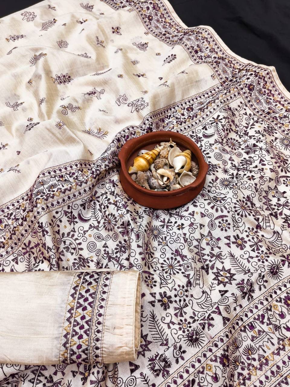 Unique Off White Embroidery Work Tussar Silk Saree With Susurrous Blouse Piece
